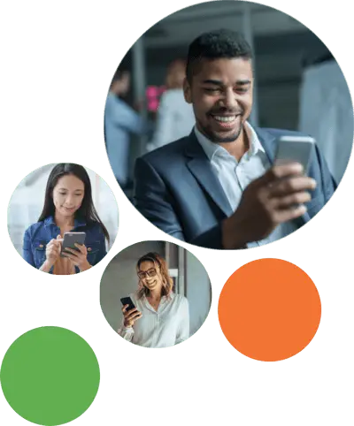 Various circles some with colors and others with images of happy employees in them