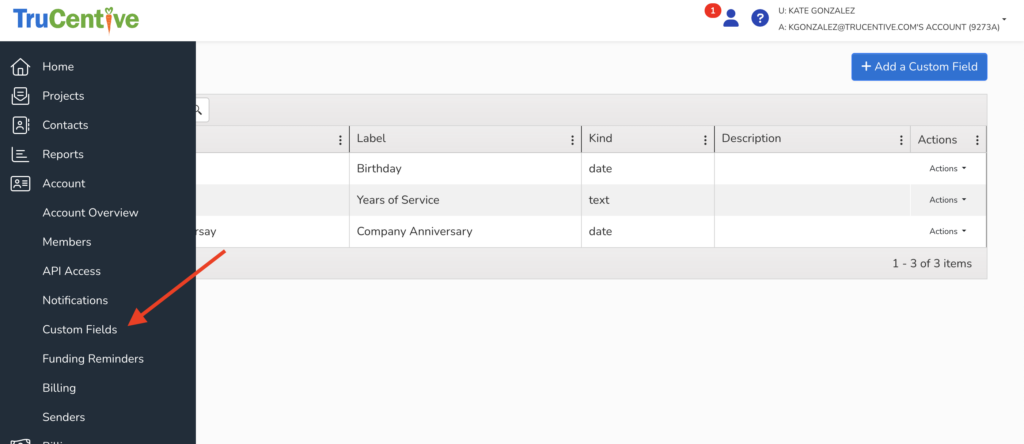 If you need to create a new custom field you can do this by going to “Account” in the tool bar on the left side of the screen and then “Custom Fields” and then +Add a Custom Field
