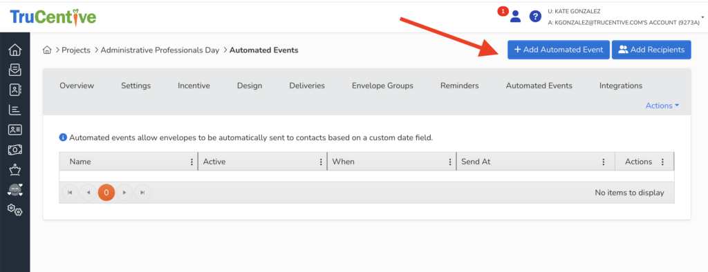 Next to set up your automated event within a project you will need to go to the “automated events” tab within your project and click on +Add Automated Event