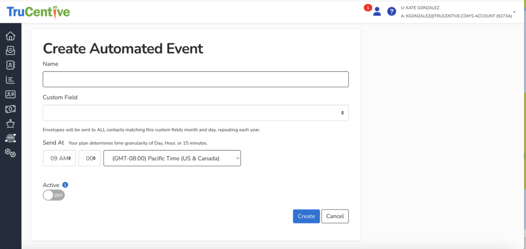 From here you will name your event, and then select the custom field that applies to the event. Choose the time of day you would like your incentive to send and then toggle the Active switch to On.