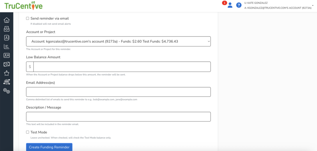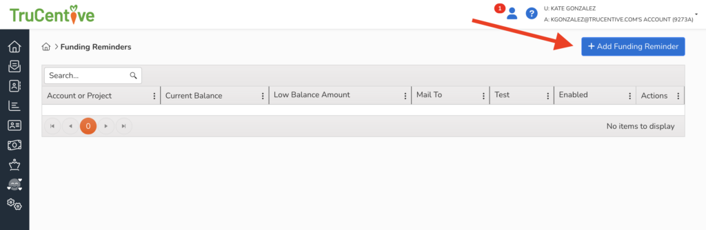 On the gray navigation bar on the left side of your screen, click the “Account” icon, then click on “Funding Reminders”.
