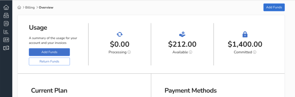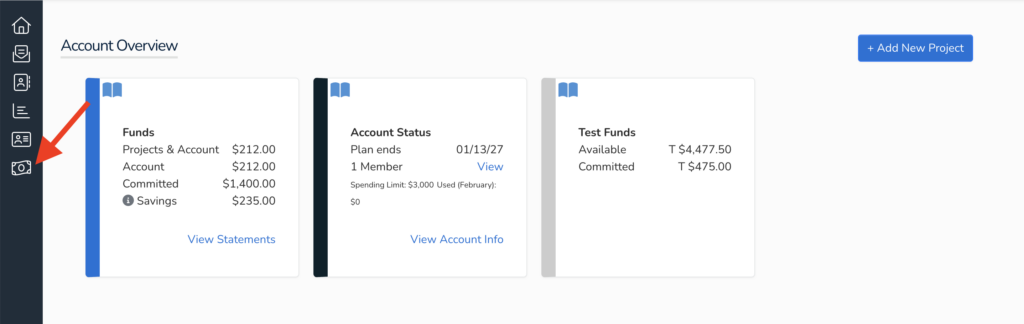 To add funds to your account you will need to log in, on the left side of the screen click on the Billing icon: