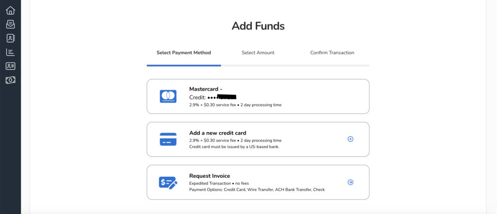 Click on Add Funds to either add funds for a credit card payment or Request Invoice for other payment methods