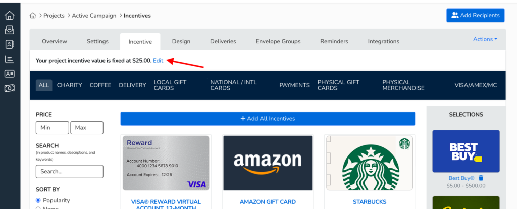 You can edit your incentive settings by clicking the “Edit” button in the Incentives tab.