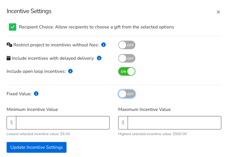 Setting a minimum and maximum value allows you to send incentives of varying amounts within that range.